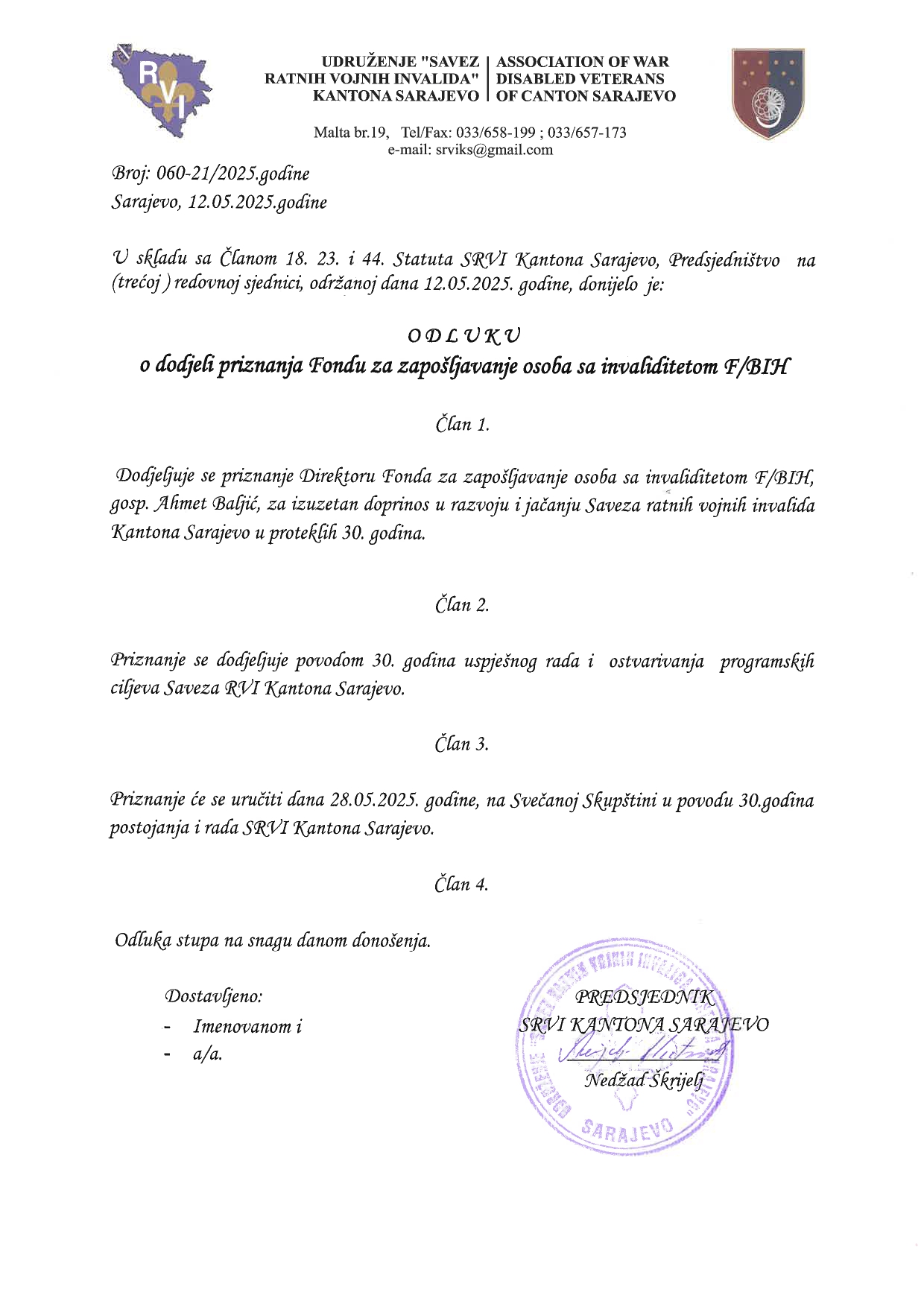 Tokom svečanosti, predsjednik Saveza ratnih vojnih invalida Kantona Sarajevo, gospodin Nežad Škrijelj, uručio je zahvalnice istaknutim pojedincima i institucijama. Među dobitnicima je i direktor Fonda za profesionalnu rehabilitaciju i zapošljavanje osoba sa invaliditetom, gospodin Ahmet Baljić. Zahvalnica je dodijeljena za njegov izuzetan doprinos u razvoju i jačanju Saveza ratnih vojnih invalida Kantona Sarajevo, kao i za predanost u unapređenju položaja osoba s invaliditetom.